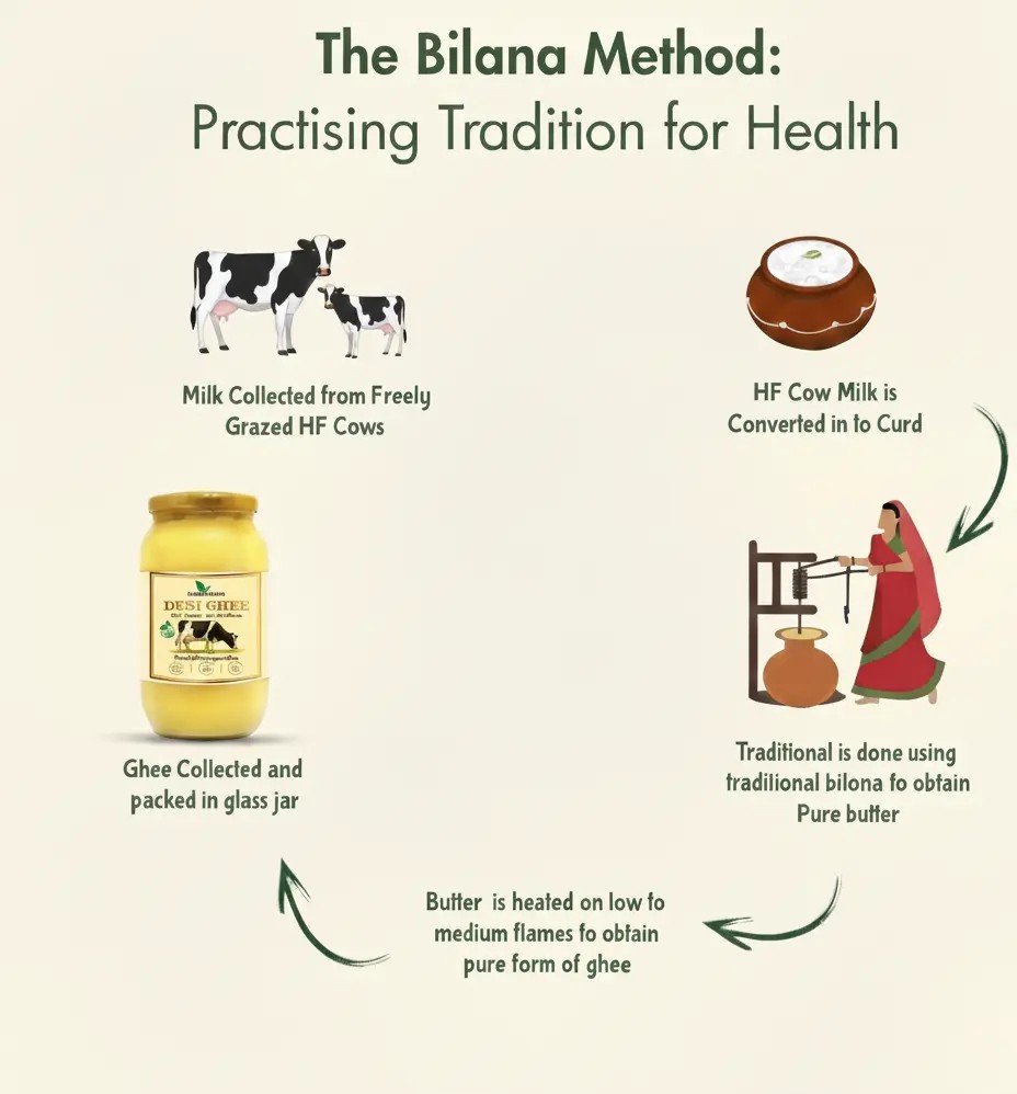 At Farmlands, we follow the traditional Bilona Method — milk from our own farm is turned into curd, churned into butter, and slowly heated to produce pure, nutrient-rich desi ghee.